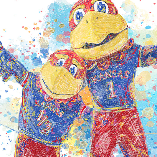 KU Jayhawk Welcoming Art: University of Kansas Big Jay and Baby Jay Splatter Canvas Print