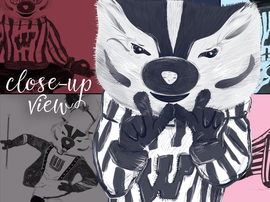 Artist, Erin Maslowski, presents a whimsical collection of tees featuring custom illustrations of the beloved Wisconsin Bucky Badger mascot in distinct poses, each artfully capturing the essence of the University of Wisconsin's spirited community. These illustrations serve as a visual testament to the shared values and enduring Wisconsin spirit that unites students, faculty, and alumni alike.