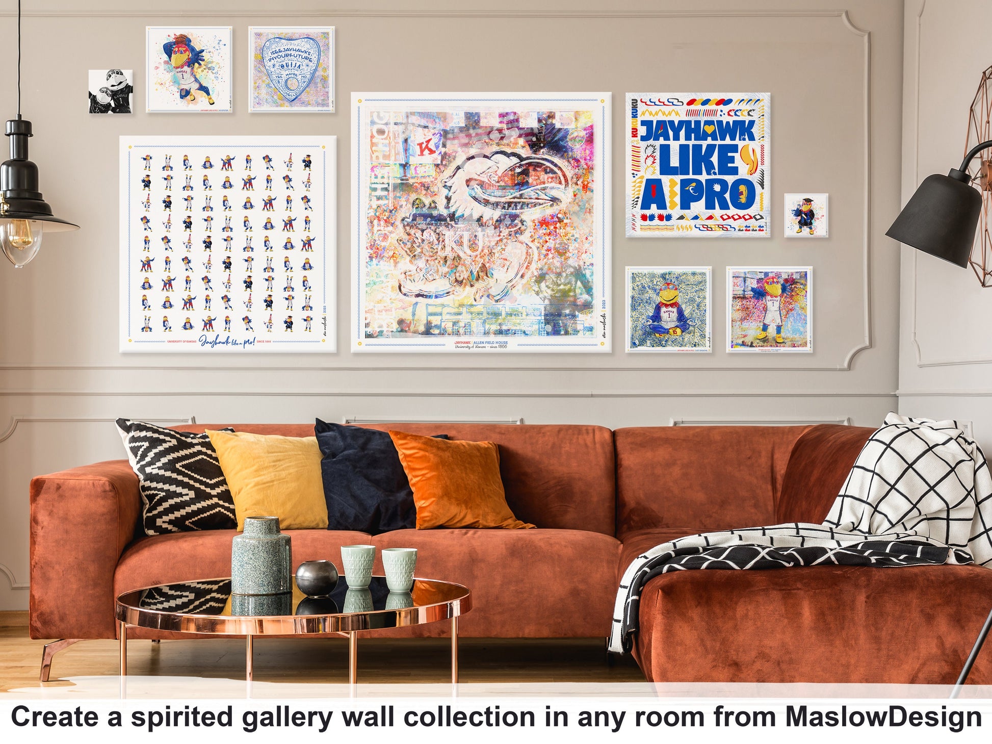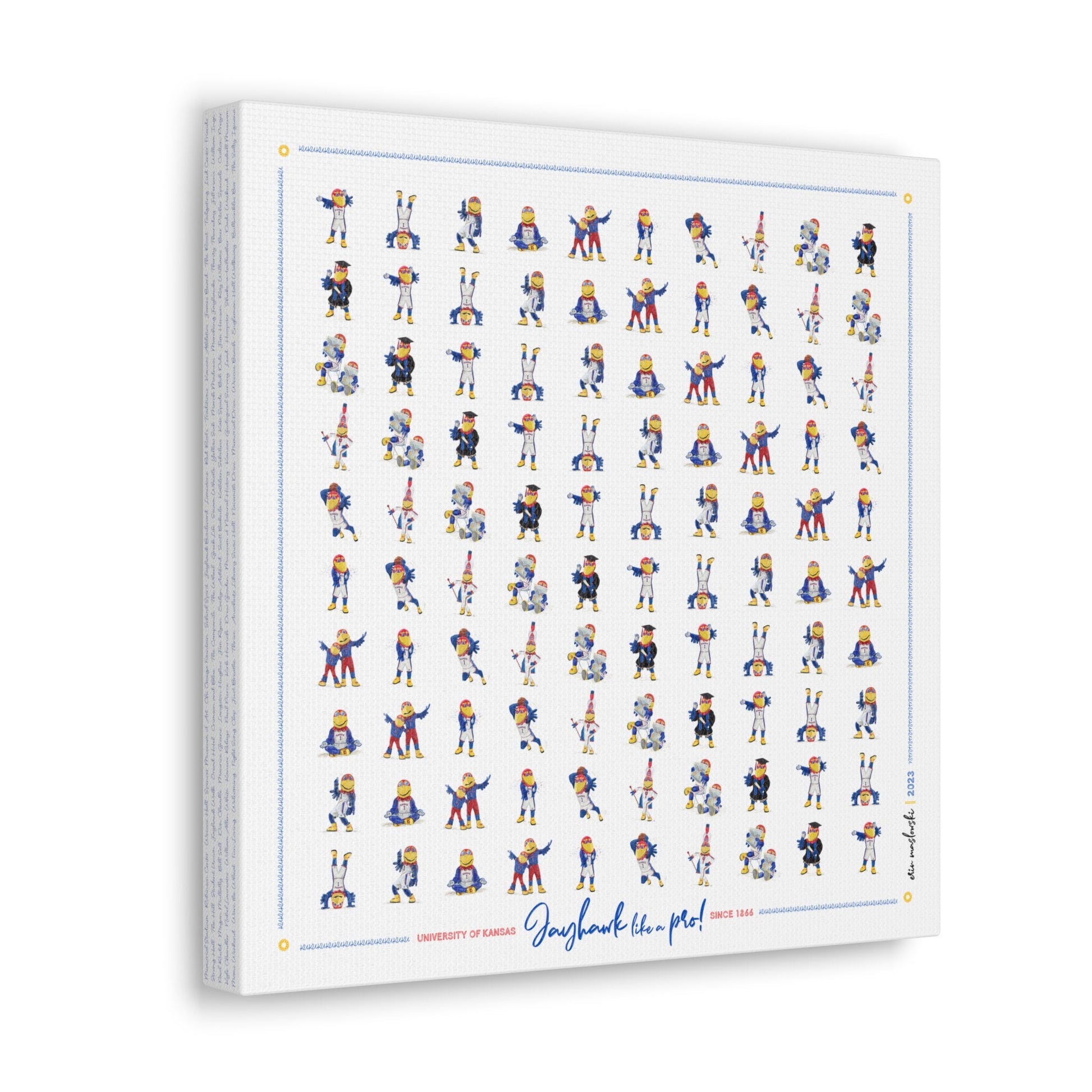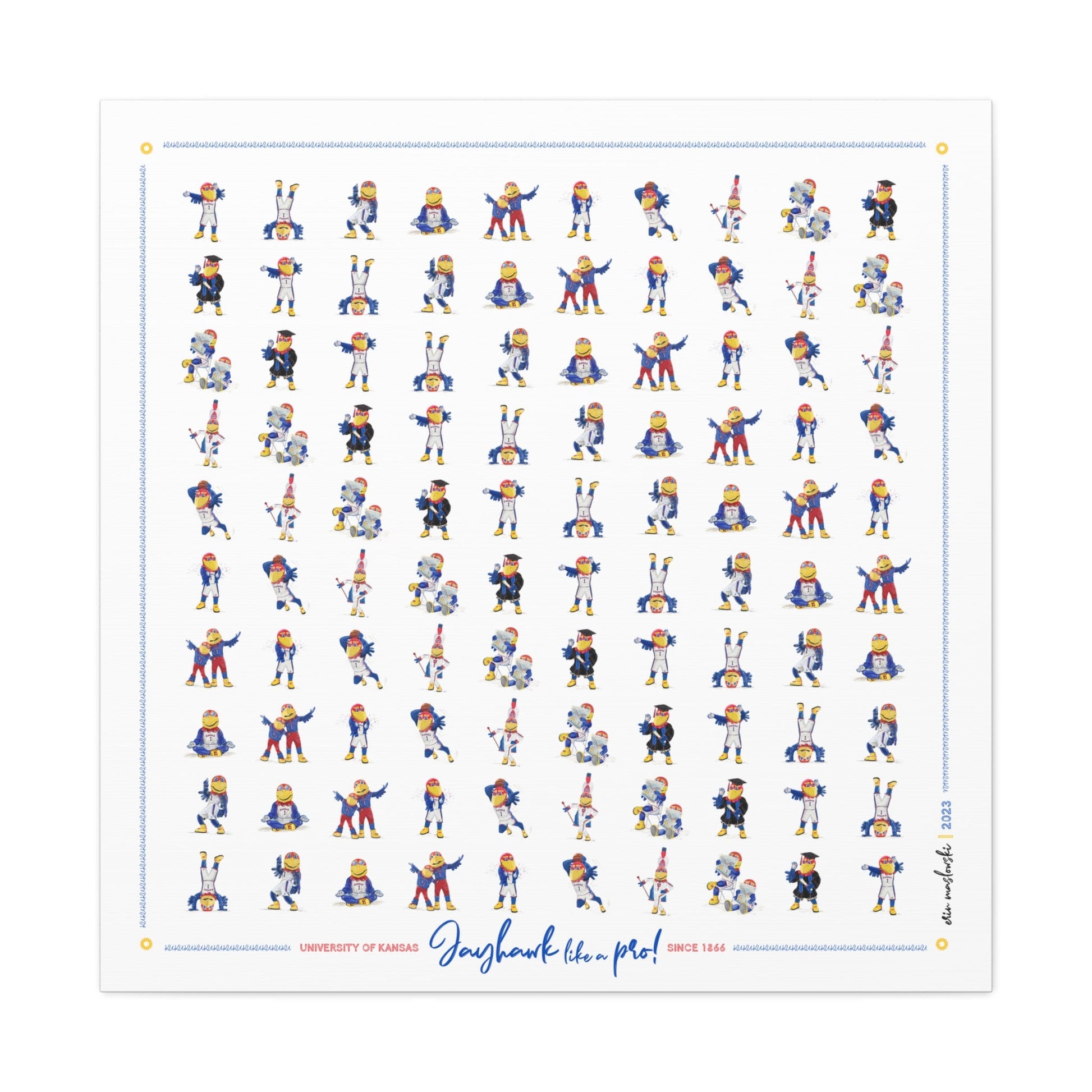 Jayhawk like a Pro | Pattern: These custom illustrations by Erin Maslowski of the Kansas Jayhawk mascot in ten iconic poses beautifully encapsulate the qualities shared by all students, faculty, and alumni, reminding us of our shared values and the Jayhawk spirit that unites us all. Each illustration is repeated 10 times to create a unique pattern of 100 Jayhawks.