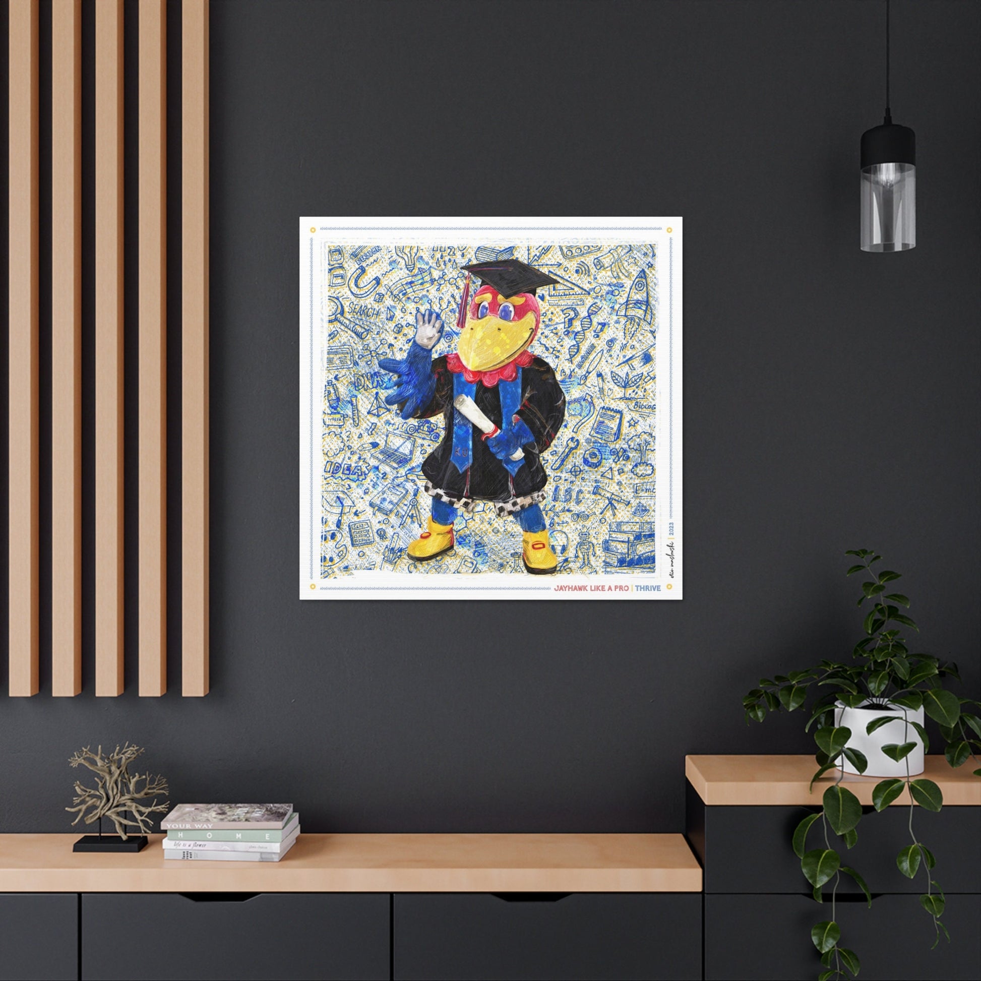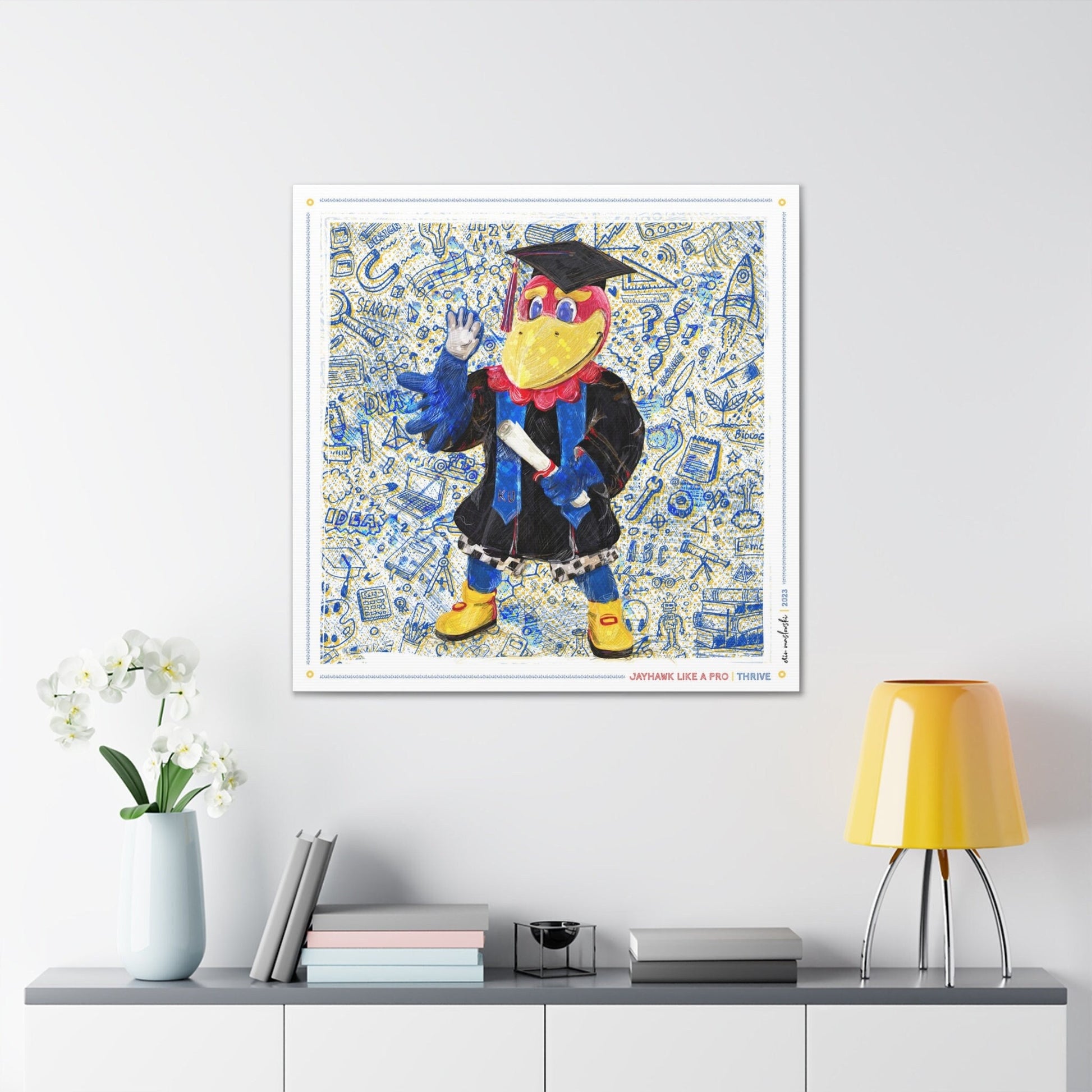 Jayhawk like a Pro | Thrive: This custom illustration stands for Jayhawks' resilience and determination to succeed. The KU Jayhawk proudly dons a graduation gown, symbolizing the culmination of academic achievement and the spirit of accomplishment. This artwork captures the essence of growth, learning, and the endless possibilities that lie ahead, inspiring all to thrive in their pursuit of knowledge and success at the University of Kansas and beyond.