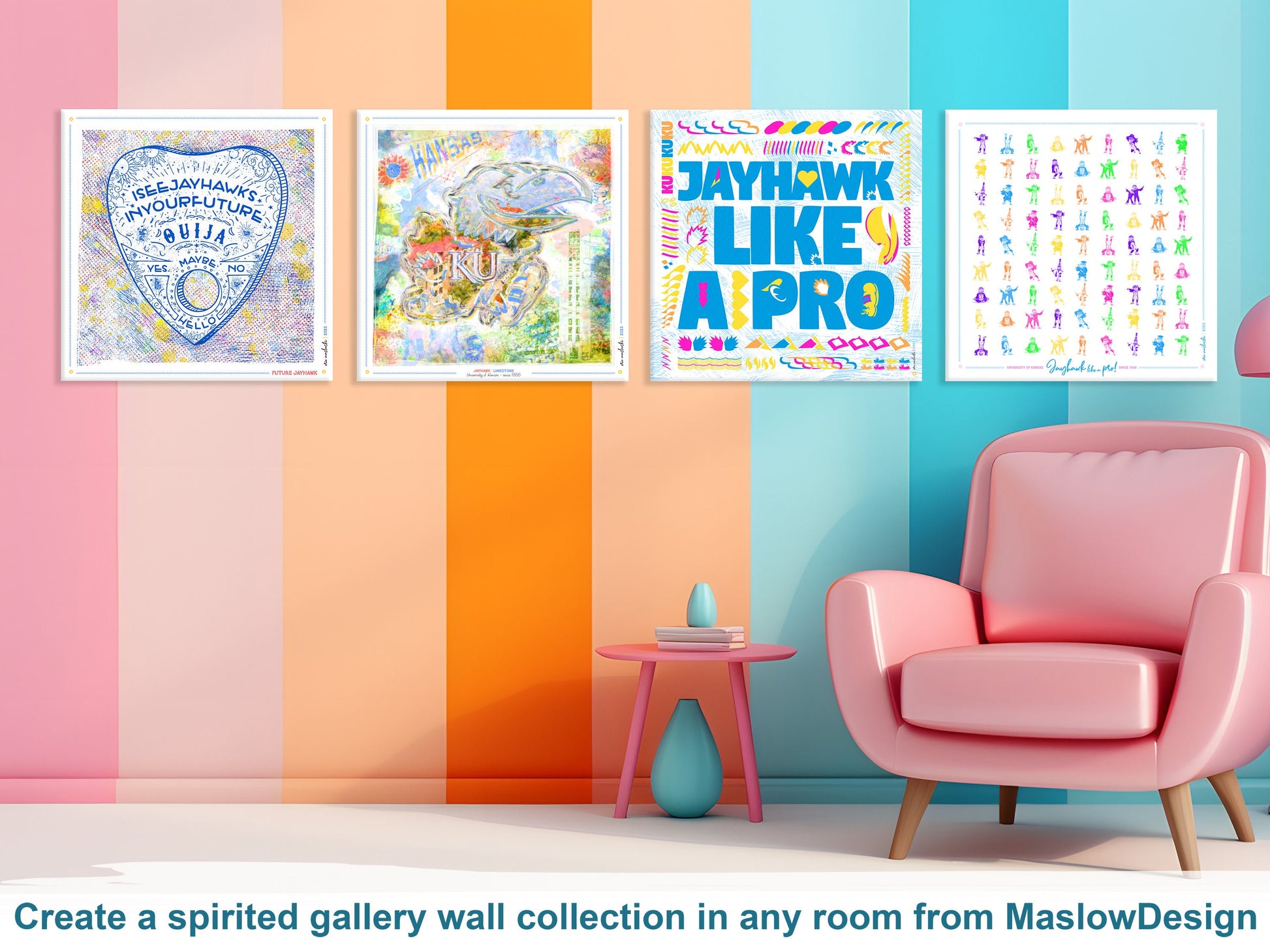 This Welcoming tailor-made illustration of Big Jay and Baby Jay is one of eleven iconic mascot poses illustrated by Erin that beautifully encapsulate the qualities shared by all students, faculty, and alumni, reminding us of our values and the Jayhawk spirit that unites us all. Purchase one Jayhawk or acquire many to craft a distinctive spirit gallery wall.