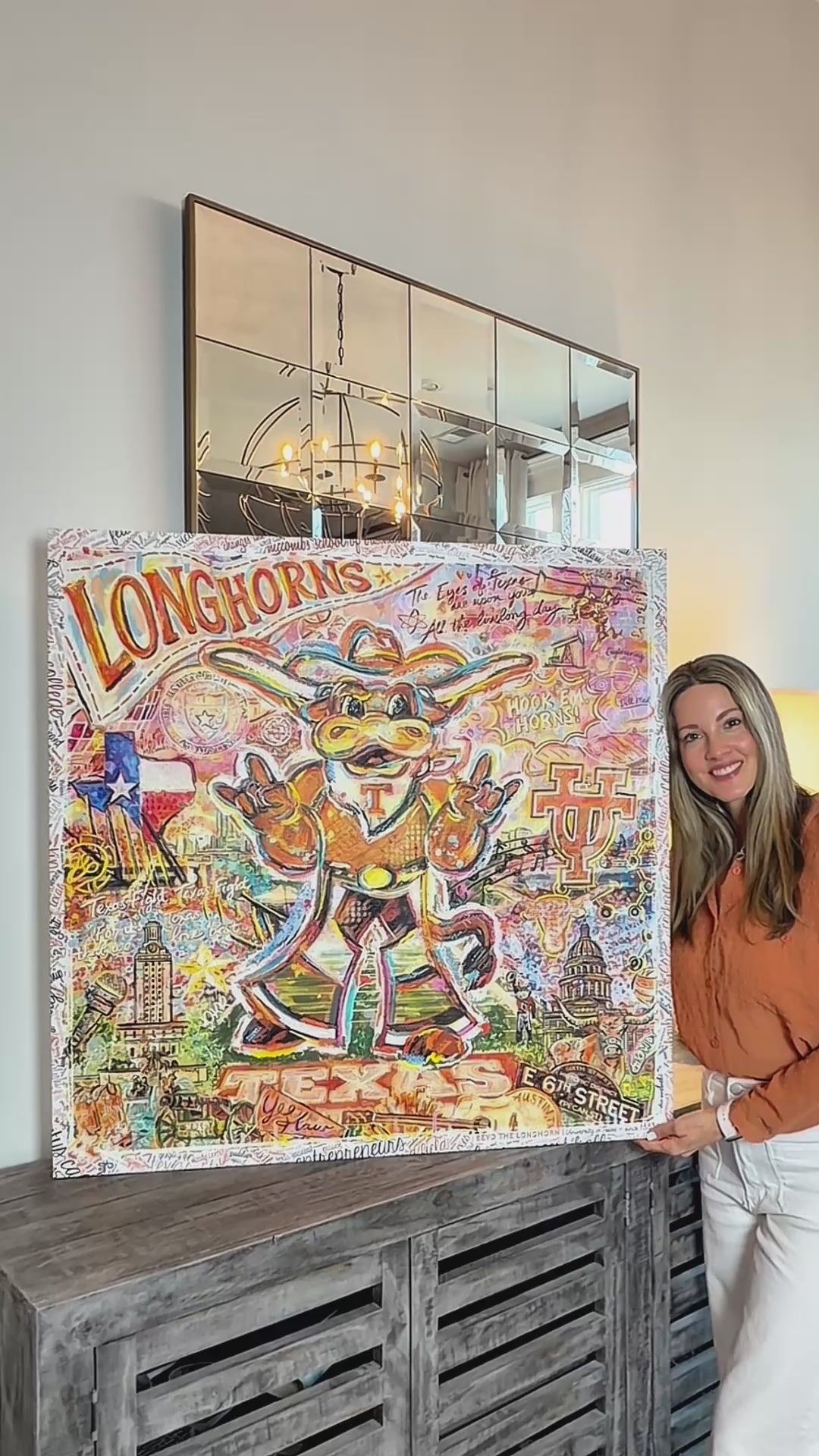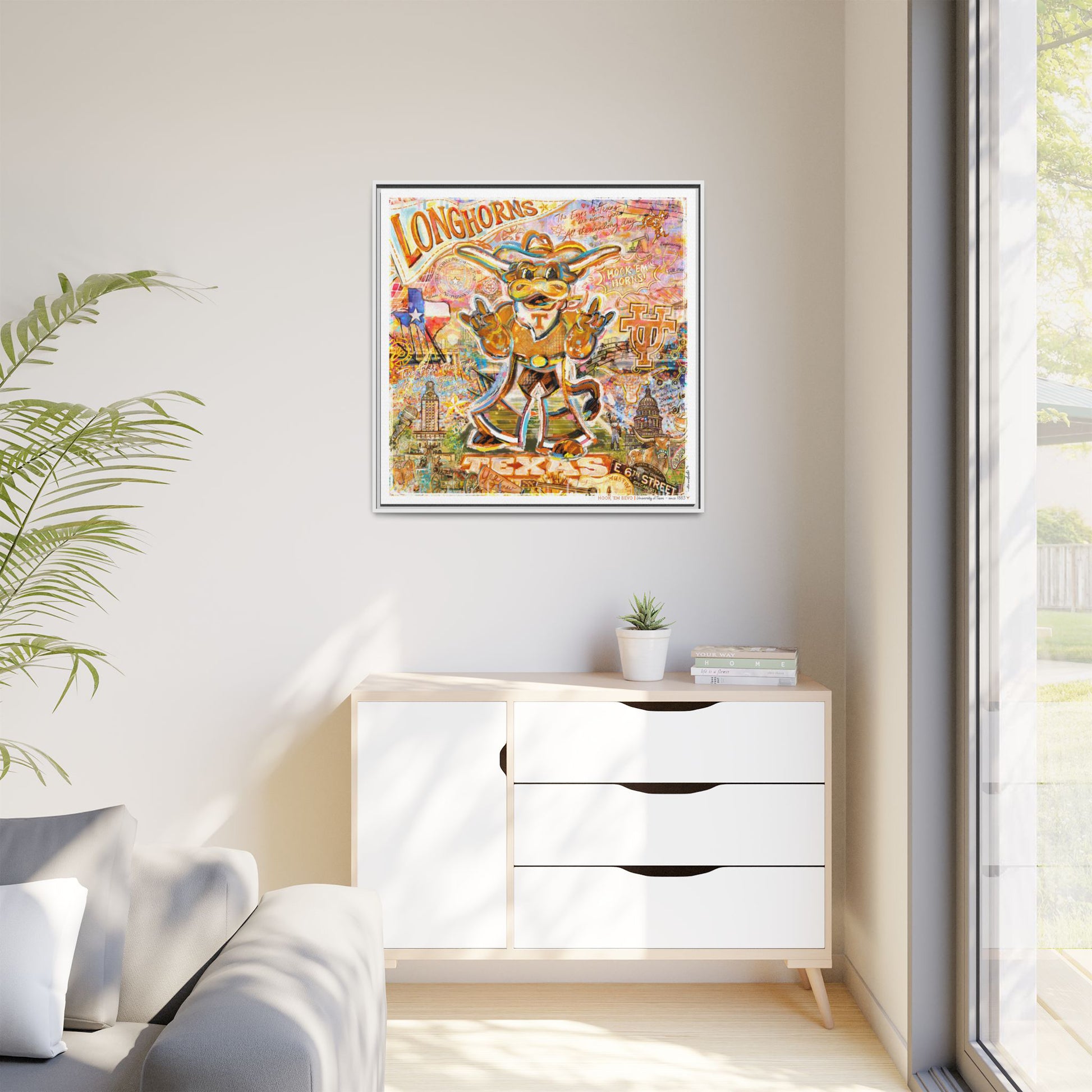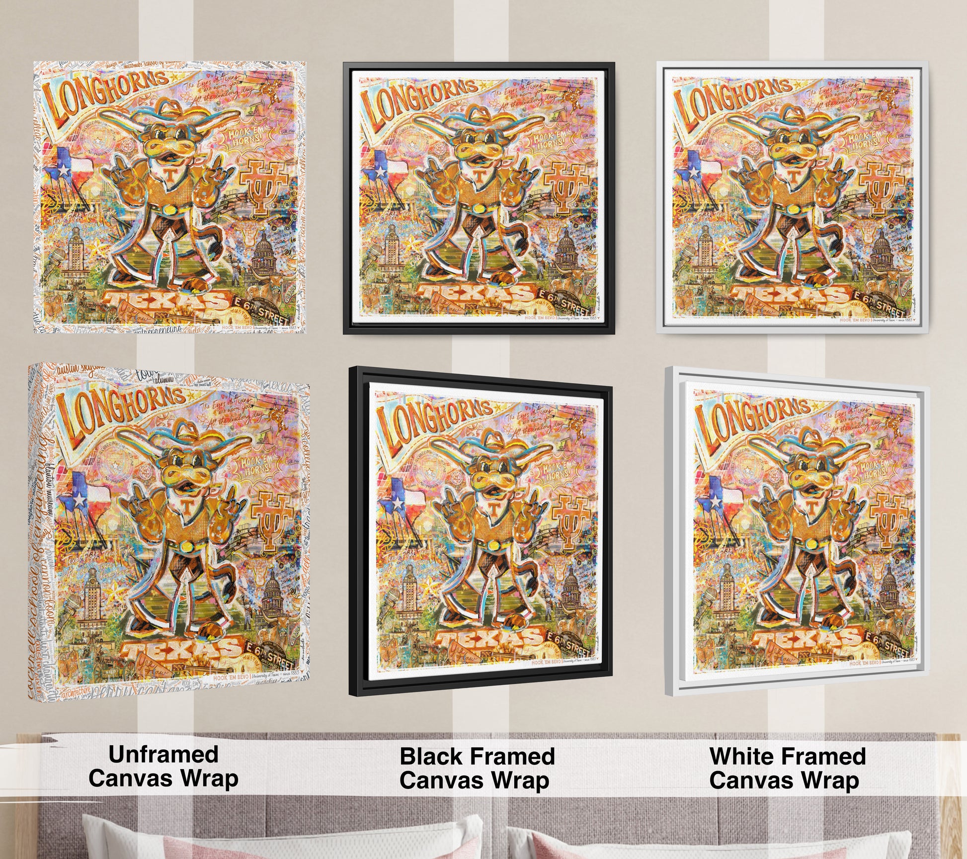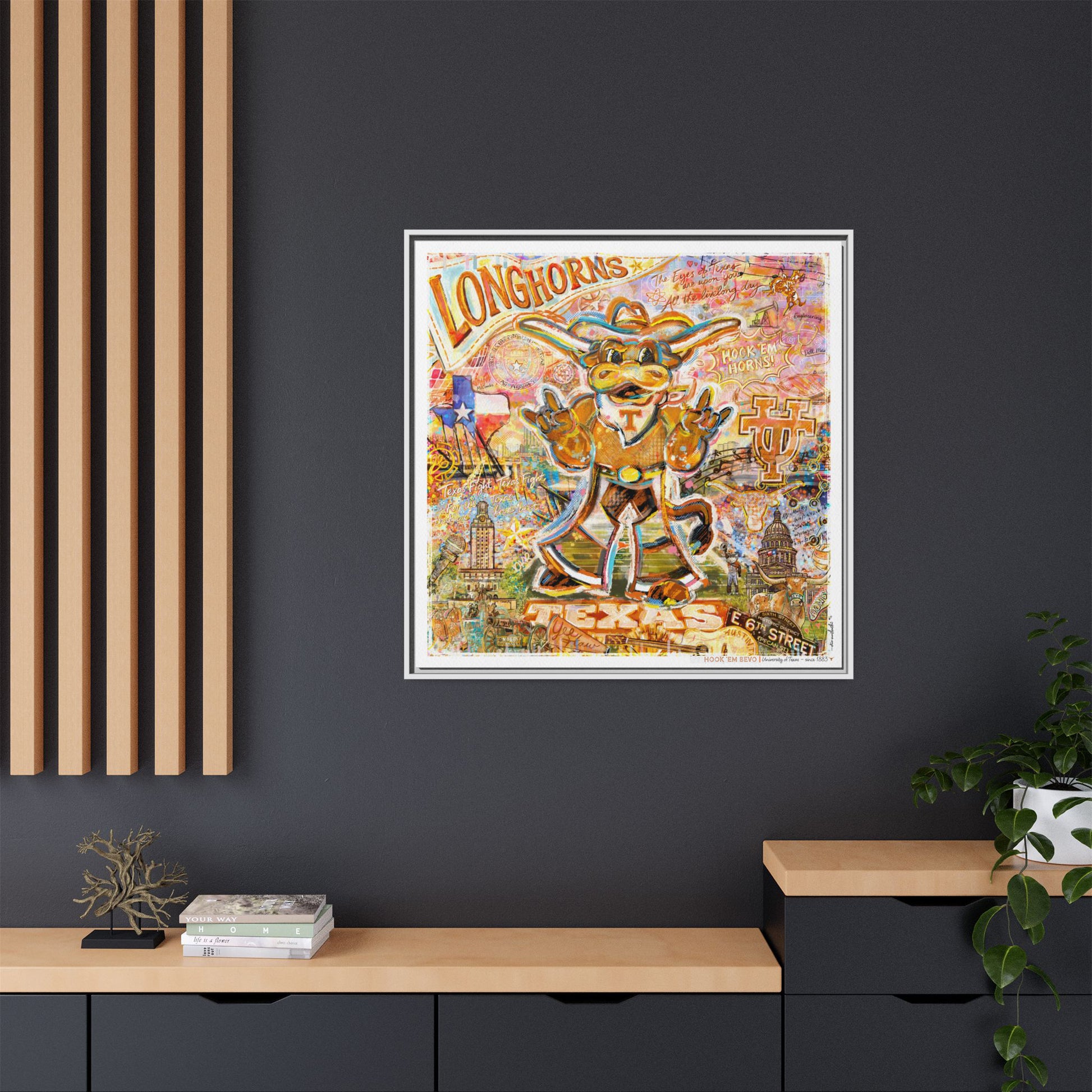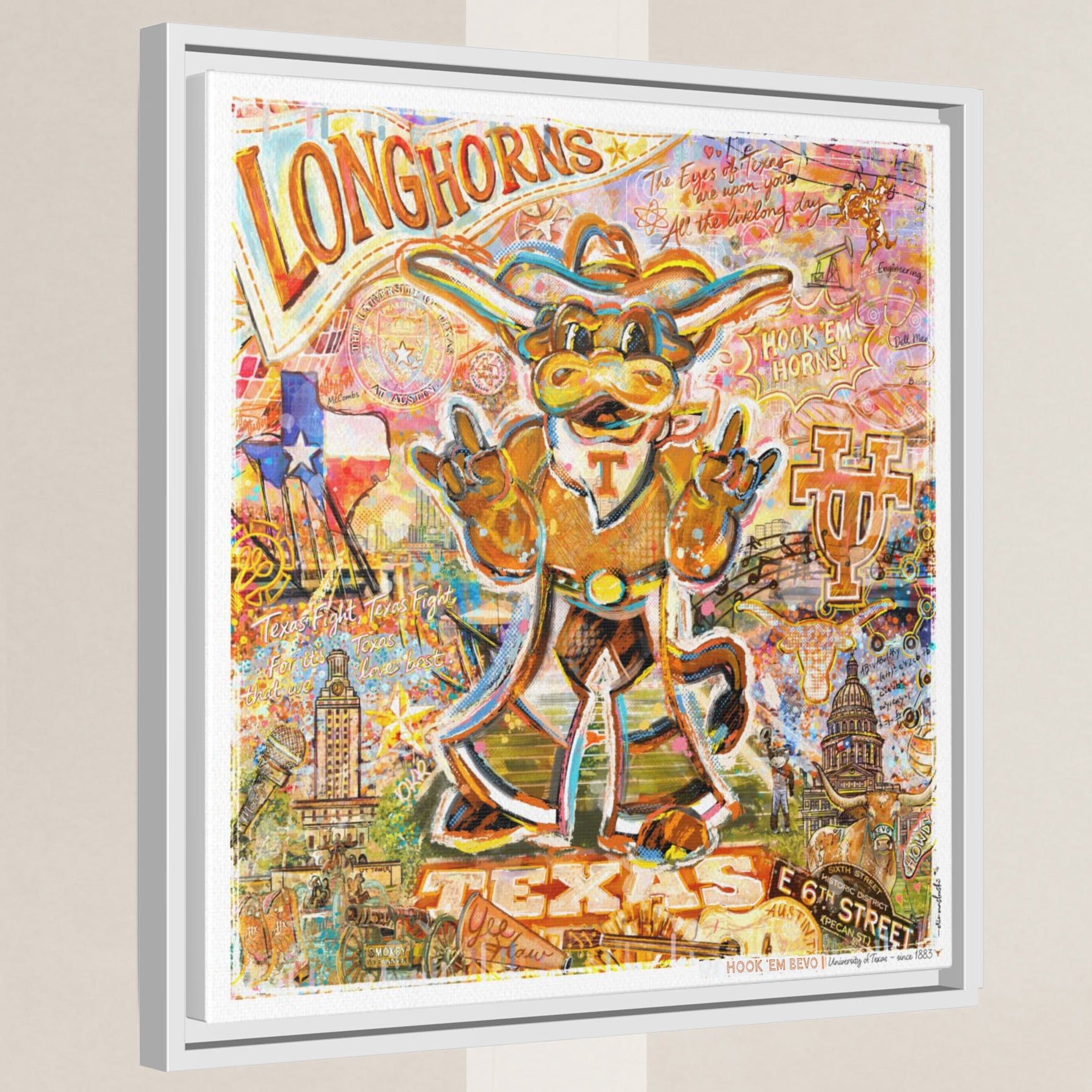 Famous alumni, campus landmarks, traditions, and Texas-inspired elements are thoughtfully wrapped around the edges of the canvas.