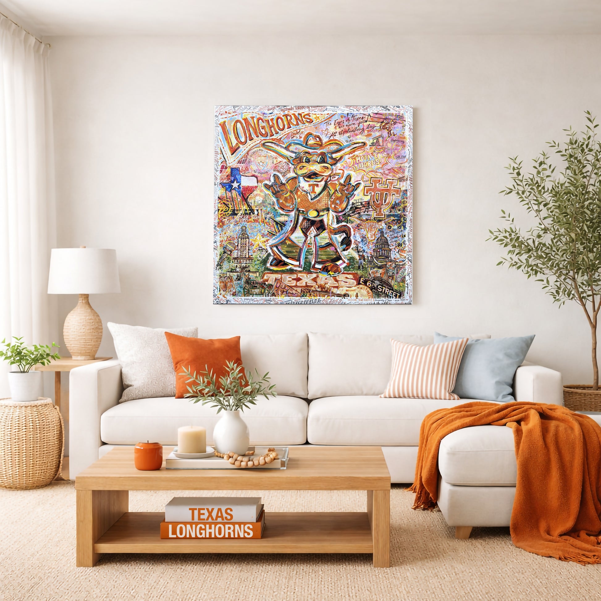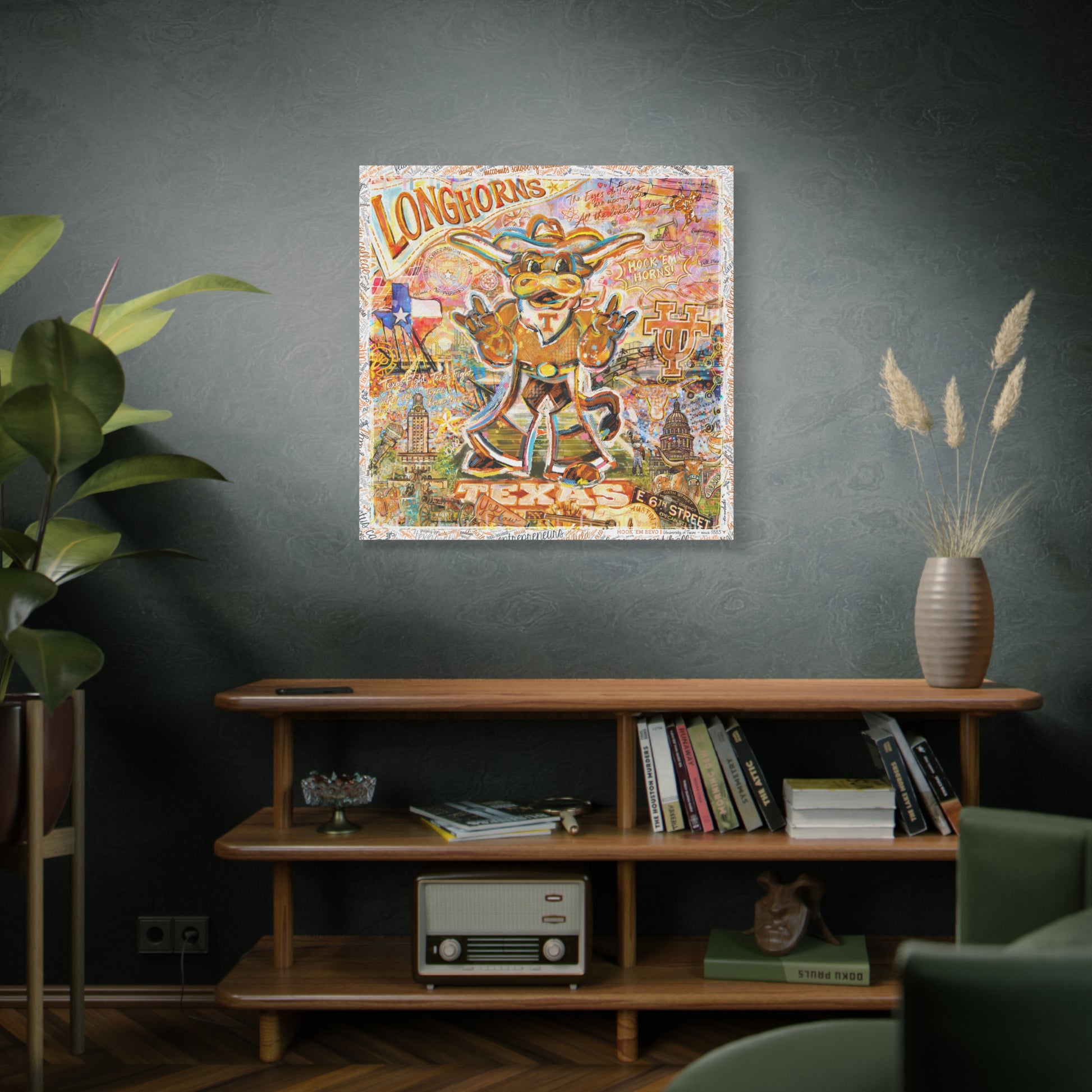 Surrounding him is a layered celebration of everything Longhorn Nation holds dear: legendary traditions, academic excellence, innovation, and the unmistakable spirit of Austin, Texas.