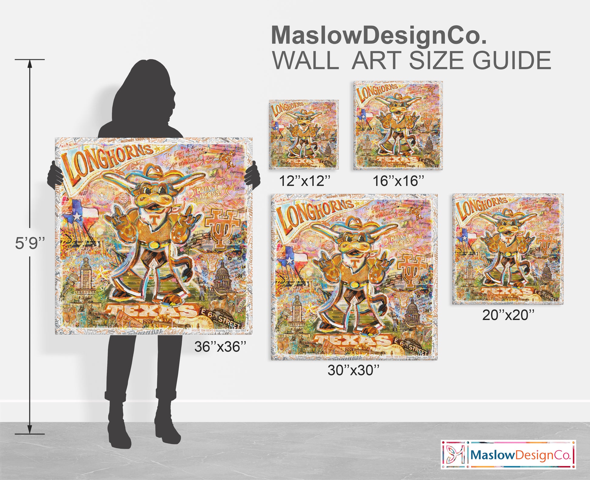 Meet Hook ‘Em’ Bevo, the University of Texas’ illustrated version of the iconic live steer Bevo, captured front and center in a powerful full-body stance, throwing the unmistakable Hook ’Em Horns. This dynamic collage painting by Erin Maslowski places him in the end zone of Darrell K Royal–Texas Memorial Stadium, overlooking the Austin skyline with the stands full of energy.